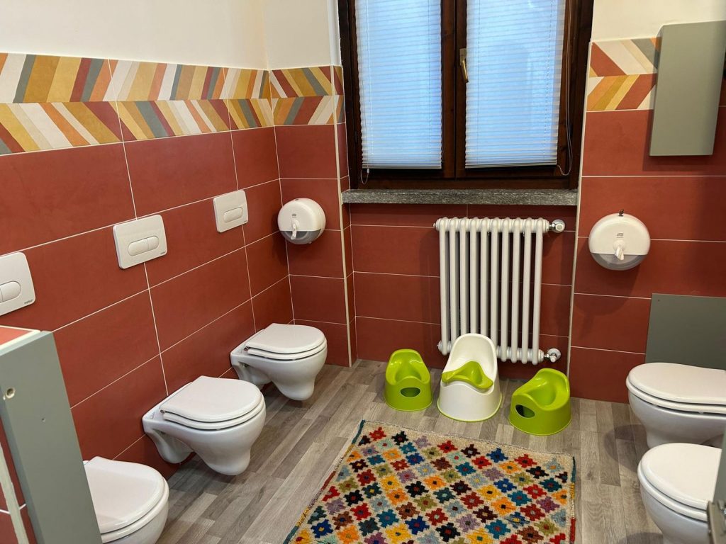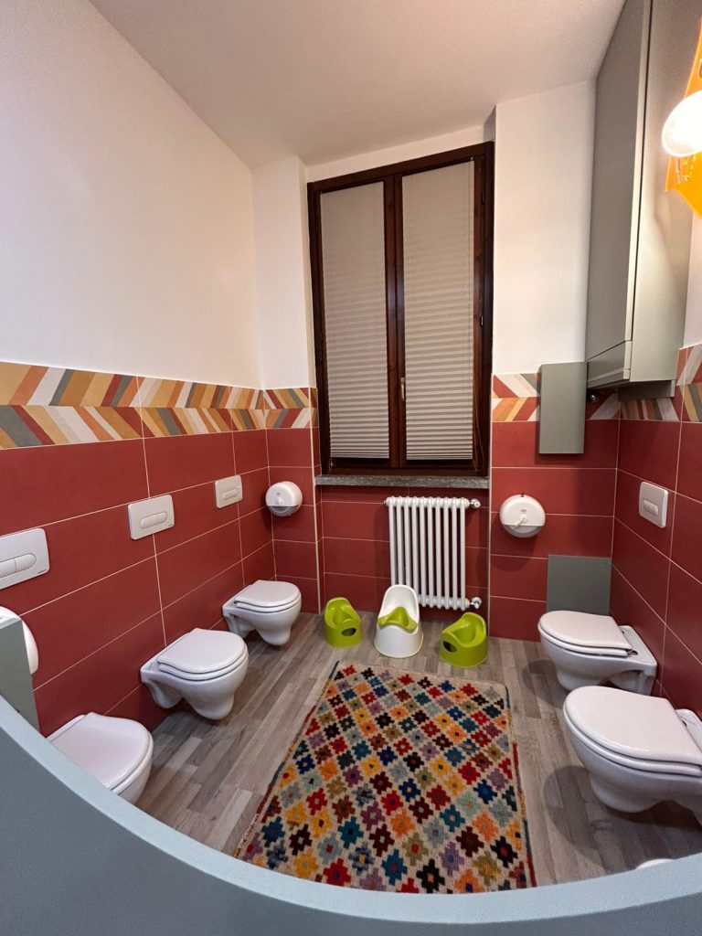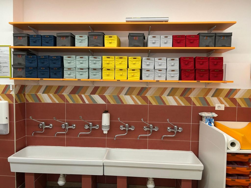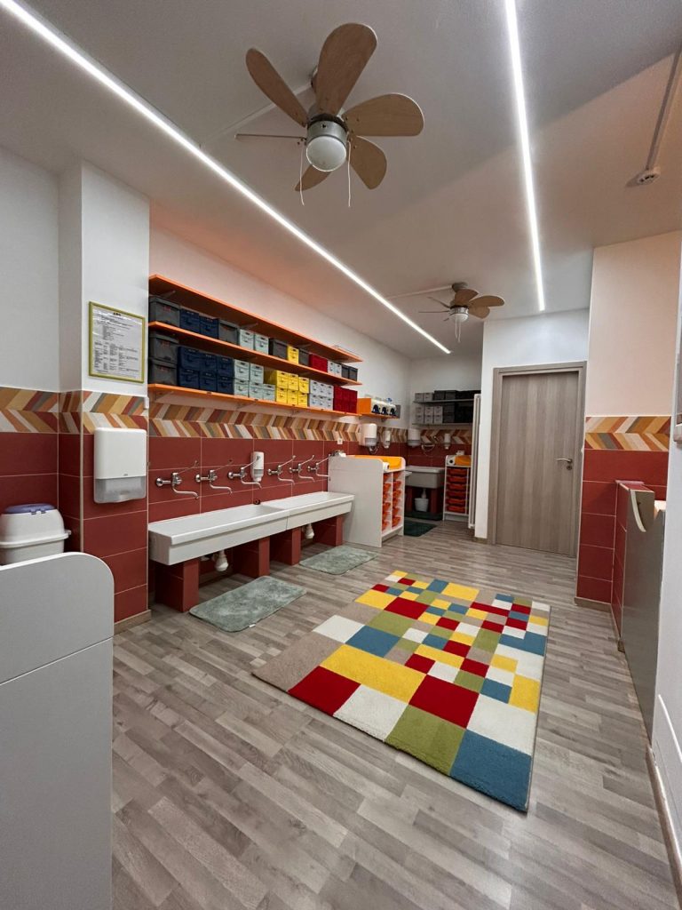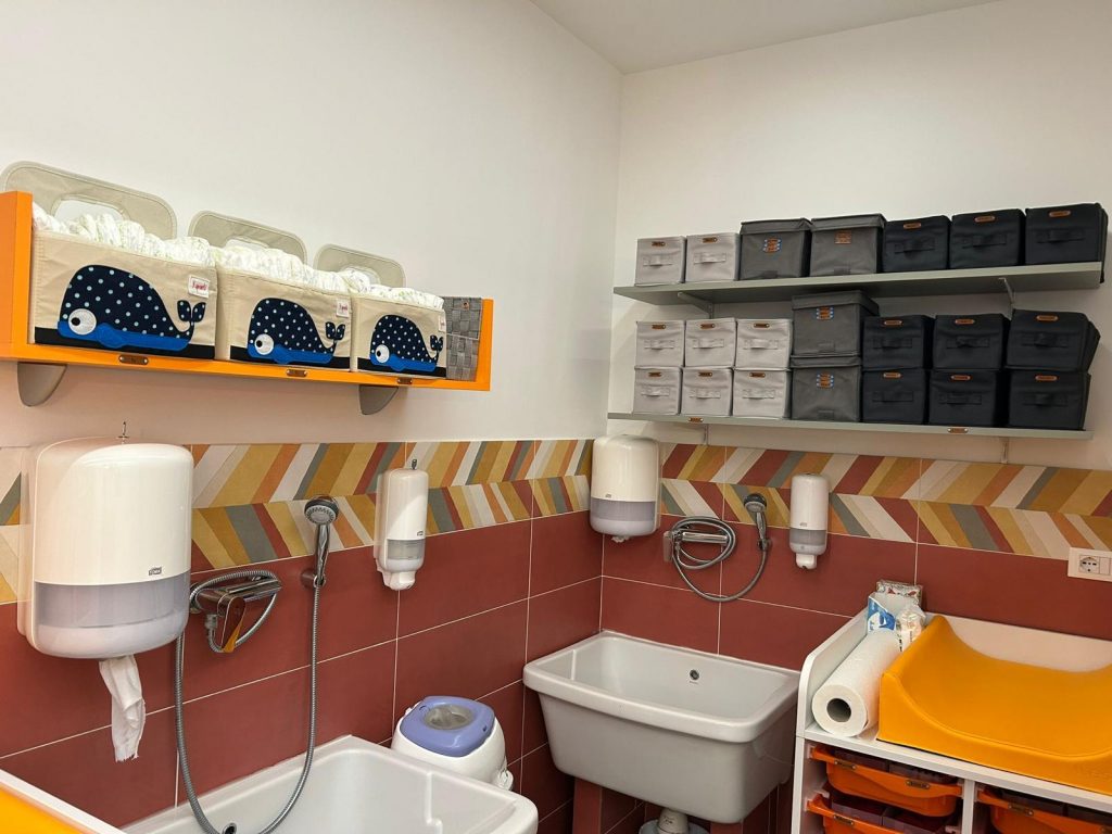 Il bagno, nel nido ABC Nursery, rappresenta uno degli spazi più utilizzati e con ritmi che consentono ai bambini il riconoscimento del momento che a noi piace chiamare “della cura”. Il bagno è dotato di lavandini e wc a misura di bambino, di fasciatoi per coloro che non hanno ancora acquisito il controllo degli sfinteri e di caselline con il nome di ciascun bambino, per riporre le loro cose. I bagni delle dipendenti, preceduti da un antibagno, sono due, uno dei quali è dotato di box doccia. La routine del cambio condiziona la struttura temporale del servizio. Questa routine deve essere accuratamente studiata. Va inserita all’interno del progetto educativo.